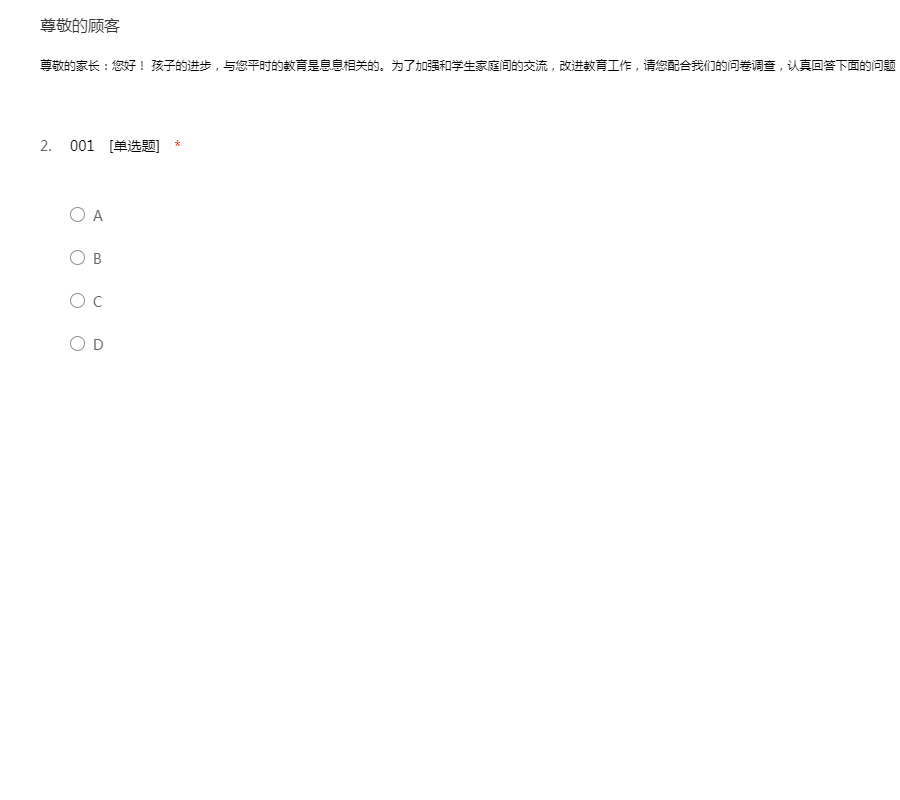 尊敬的家长:您好! 孩子的进步,与您平时的教育是息息相关的。为了加强和学生家庭间的交流,改进教育工作,请您配合我们的问卷调查,认真回答下面的问题, 谢谢合作!
