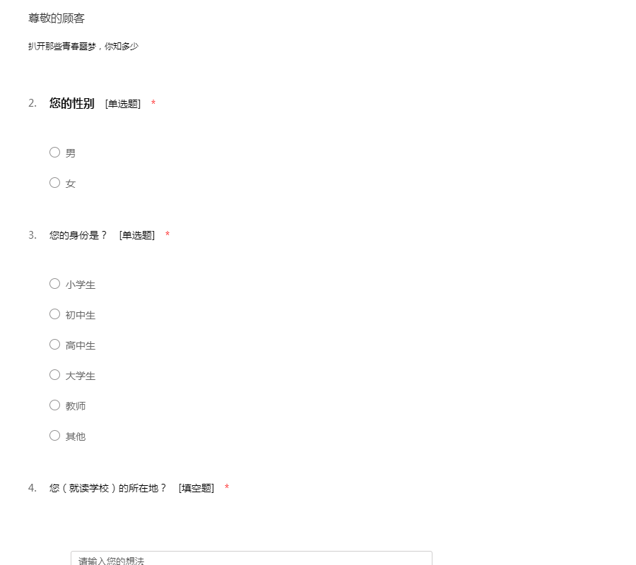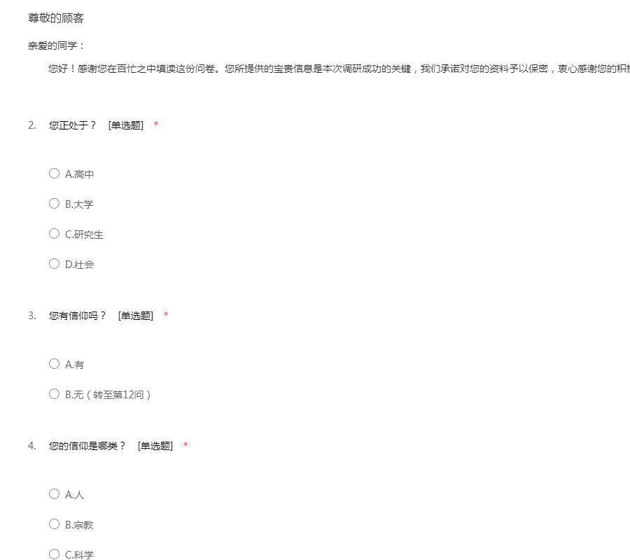 亲爱的同学: 您好!感谢您在百忙之中填读这份问卷。您所提供的宝贵信息是本次调研成功的关键,我们承诺对您的资料予以保密,衷心感谢您的积极参与和支持!
