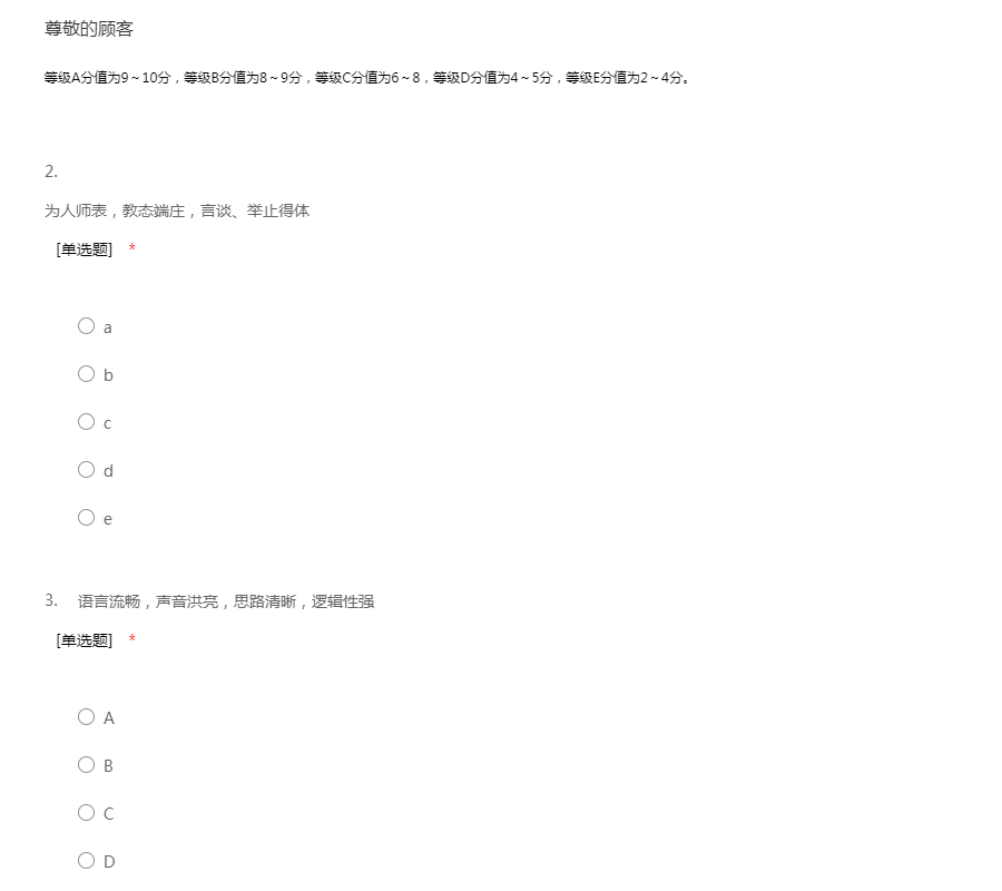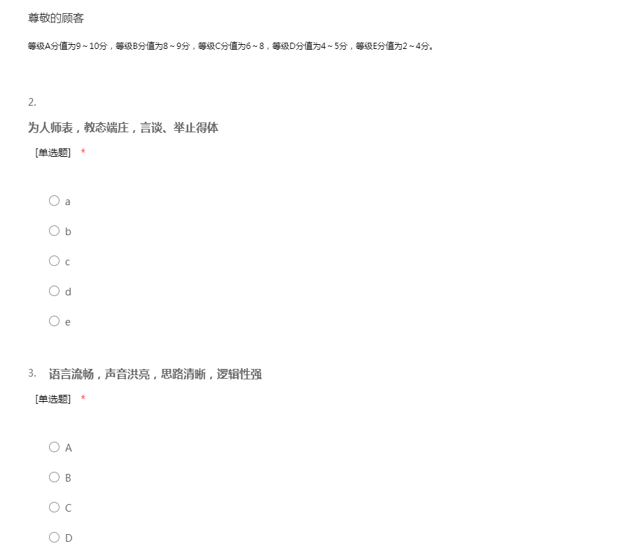 等级A分值为9~10分,等级B分值为8~9分,等级C分值为6~8,等级D分值为4~5分,等级E分值为2~4分。