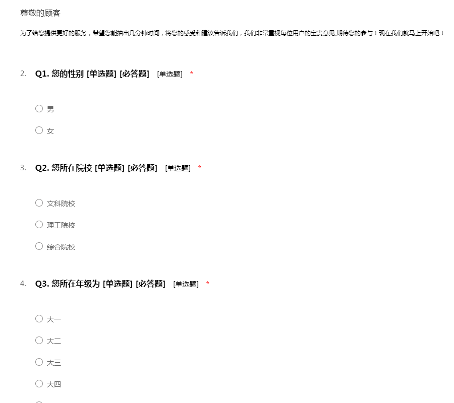 您好!首先非常感谢您能参与我们的调查活动中,我们是在校大学生,需要做一个关于校园社区应用软件需求的调查,非常希望您能配合我们的调查活动!