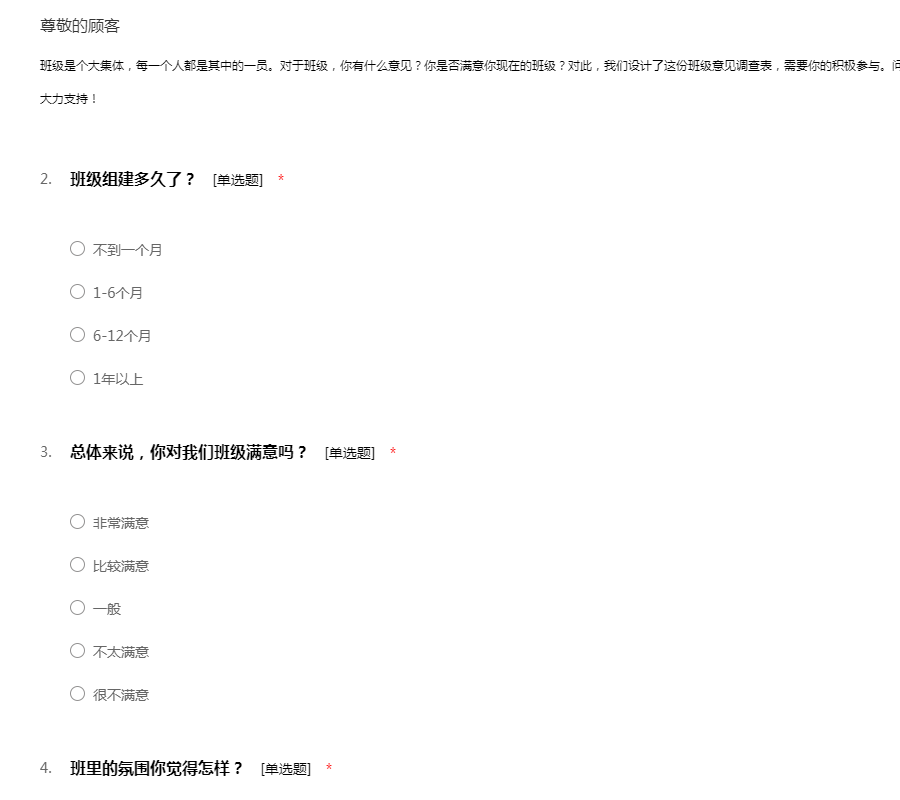 班级是个大集体,每一个人都是其中的一员。对于班级,你有什么意见?你是否满意你现在的班级?对此,我们设计了这份班级意见调查表,需要你的积极参与。问卷不记名,请根据你的实际情况填答。感谢你的大力支持!