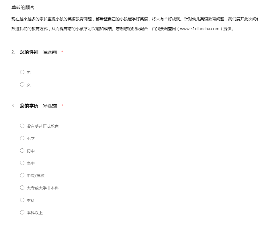 现在越来越多的家长重视小孩的英语教育问题,都希望自己的小孩能学好英语,将来有个好成就。针对幼儿英语教育问题,我们展开此次问卷调查,希望您能如实回答,以便,我们改进我们的教育方式,从而提高您的小孩学习兴趣和成绩。感谢您的积极配合!由我要调查网(www.51diaocha.com)提供。