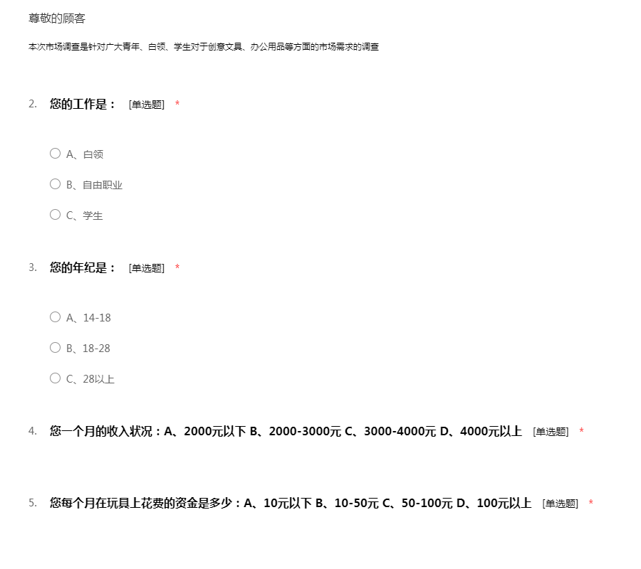 本次市场调查是针对广大青年、白领、学生对于创意文具、办公用品等方面的市场需求的调查