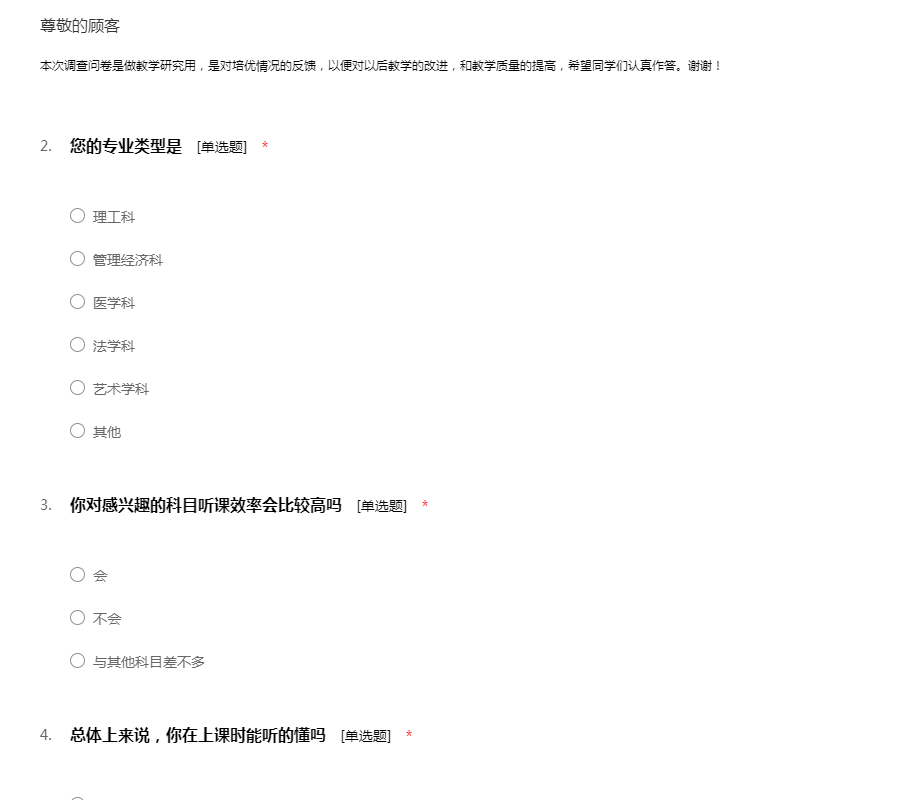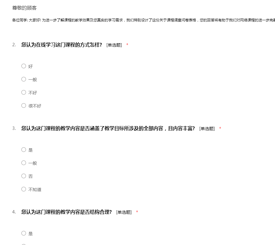 各位同学: 大家好! 为进一步了解课程的教学效果及您真实的学习需求,我们特别设计了这份关于课程调查问卷表格,您的回答将有助于我们对网络课程的进一步完善,感谢大家的积极合作。
