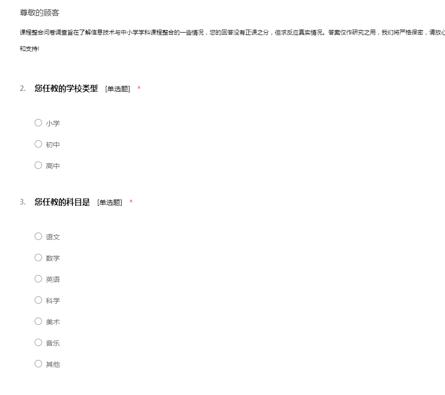 课程整合问卷调查旨在了解信息技术与中小学学科课程整合的一些情况,您的回答没有正误之分,但求反应真实情况。答案仅作研究之用,我们将严格保密,请放心填写课程整合问卷调查。再次感谢您的大力合作和支持!