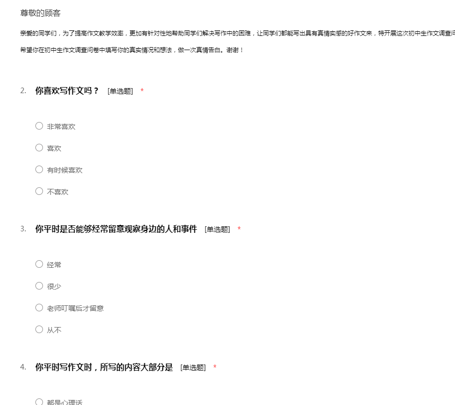 亲爱的同学们,为了提高作文教学效率,更加有针对性地帮助同学们解决写作中的困难,让同学们都能写出具有真情实感的好作文来,特开展这次初中生作文调查问卷活动。同学们,欢迎你们参加本次问卷调查,希望你在初中生作文调查问卷中填写你的真实情况和想法,做一次真情告白。谢谢!
