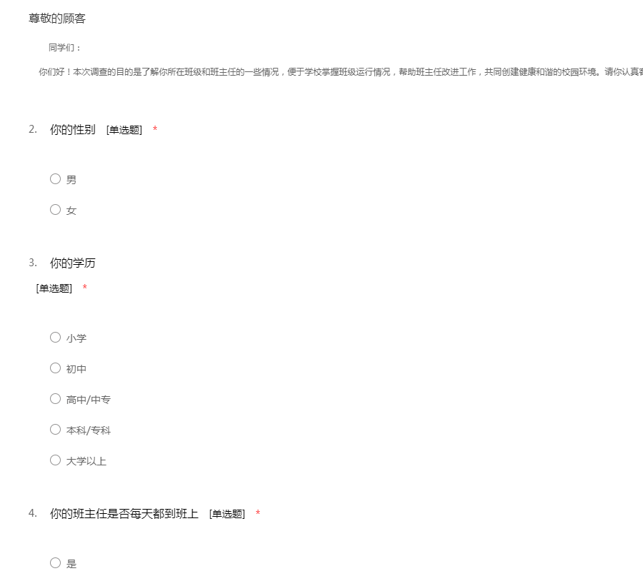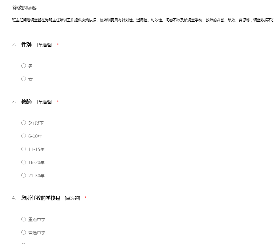 班主任问卷调查旨在为班主任培训工作提供决策依据,使培训更具有针对性、适用性、时效性。问卷不涉及被调查学校、教师的名誉、绩效、奖惩等,调查数据不公开,请被调查者需真实填写班主任的调查问卷。
