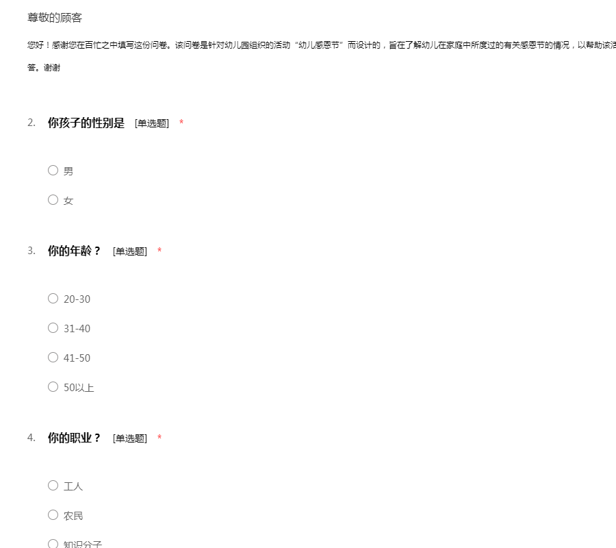 您好!感谢您在百忙之中填写这份问卷。该问卷是针对幼儿园组织的活动“幼儿感恩节”而设计的,旨在了解幼儿在家庭中所度过的有关感恩节的情况,以帮助该活动更有效地进行。请在您认为合适的答案里作答。谢谢