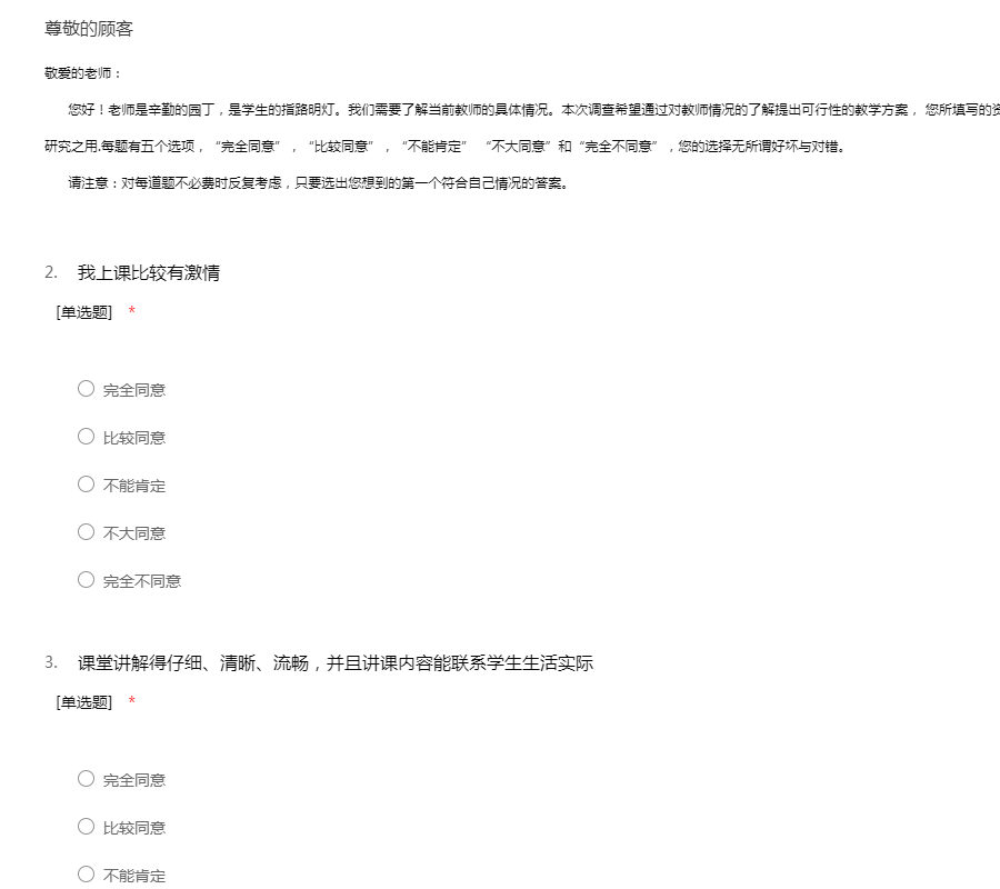 敬爱的老师: 您好!老师是辛勤的园丁,是学生的指路明灯。我们需要了解当前教师的具体情况。本次调查希望通过对教师情况的了解提出可行性的教学方案, 您所填写的资料,不做个别探究,只做综合分析,纯粹供学术研究之用.每题有五个选项,“完全同意”,“比较同意”,“不能肯定” “不大同意”和“完全不同意”,您的选择无所谓好坏与对错。 请注意:对每道题不必费时反复考虑,只要选出您想到的第一个符合自己情况的答案。