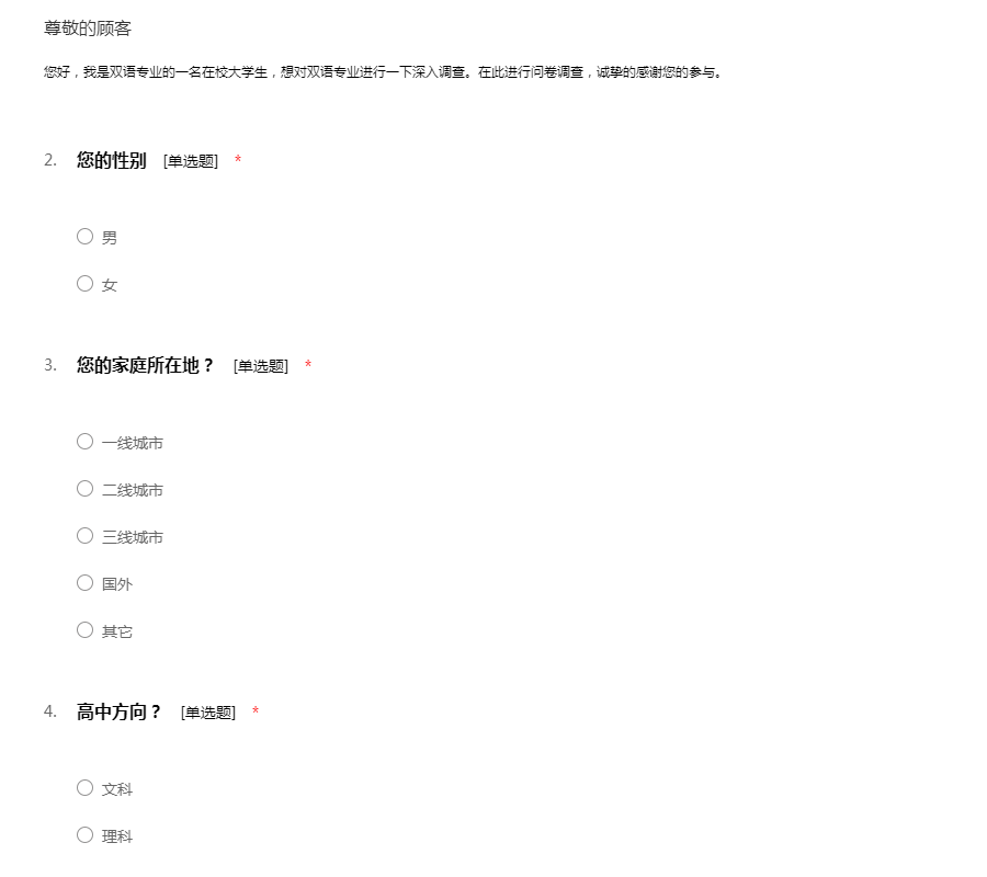 您好,我是双语专业的一名在校大学生,想对双语专业进行一下深入调查。在此进行问卷调查,诚挚的感谢您的参与。