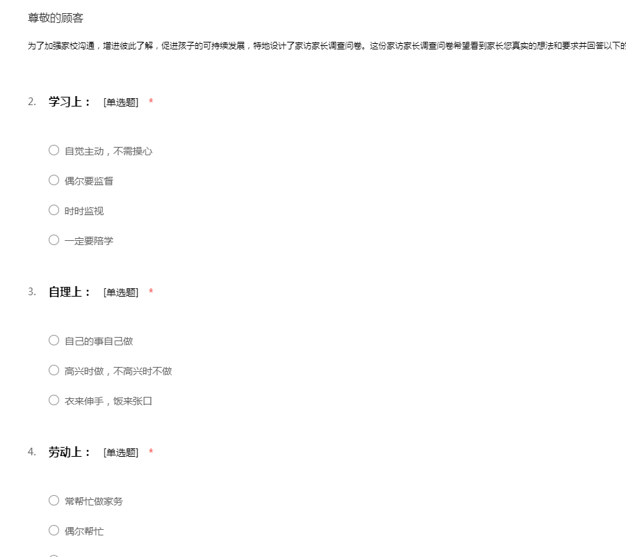 为了加强家校沟通,增进彼此了解,促进孩子的可持续发展,特地设计了家访家长调查问卷。这份家访家长调查问卷希望看到家长您真实的想法和要求并回答以下的几个问题。谢谢您的配合!