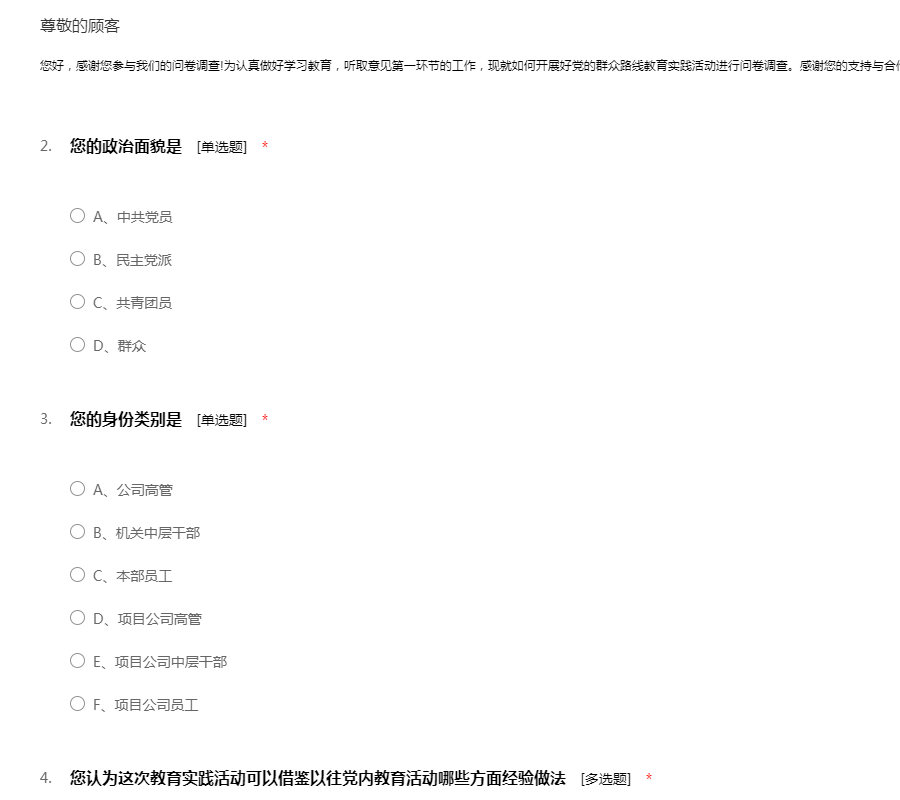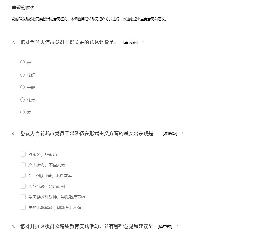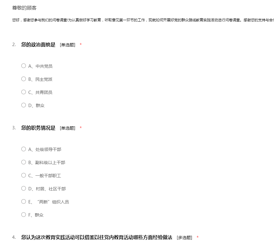 您好,感谢您参与我们的问卷调查!为认真做好学习教育,听取意见第一环节的工作,现就如何开展好党的群众路线教育实践活动进行问卷调查。感谢您的支持与合作!