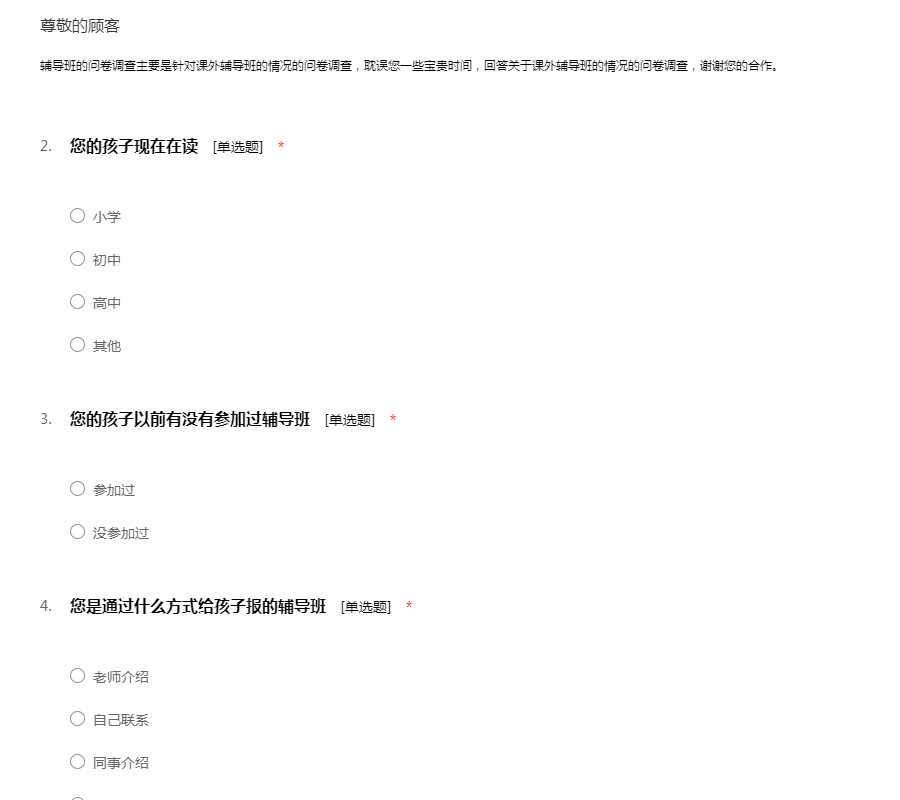 辅导班的问卷调查主要是针对课外辅导班的情况的问卷调查,耽误您一些宝贵时间,回答关于课外辅导班的情况的问卷调查,谢谢您的合作。