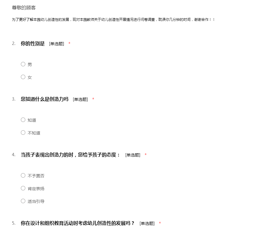 为了更好了解本园幼儿创造性的发展,现对本园教师关于幼儿创造性开展情况进行问卷调查,耽误你几分钟的时间,谢谢合作!!