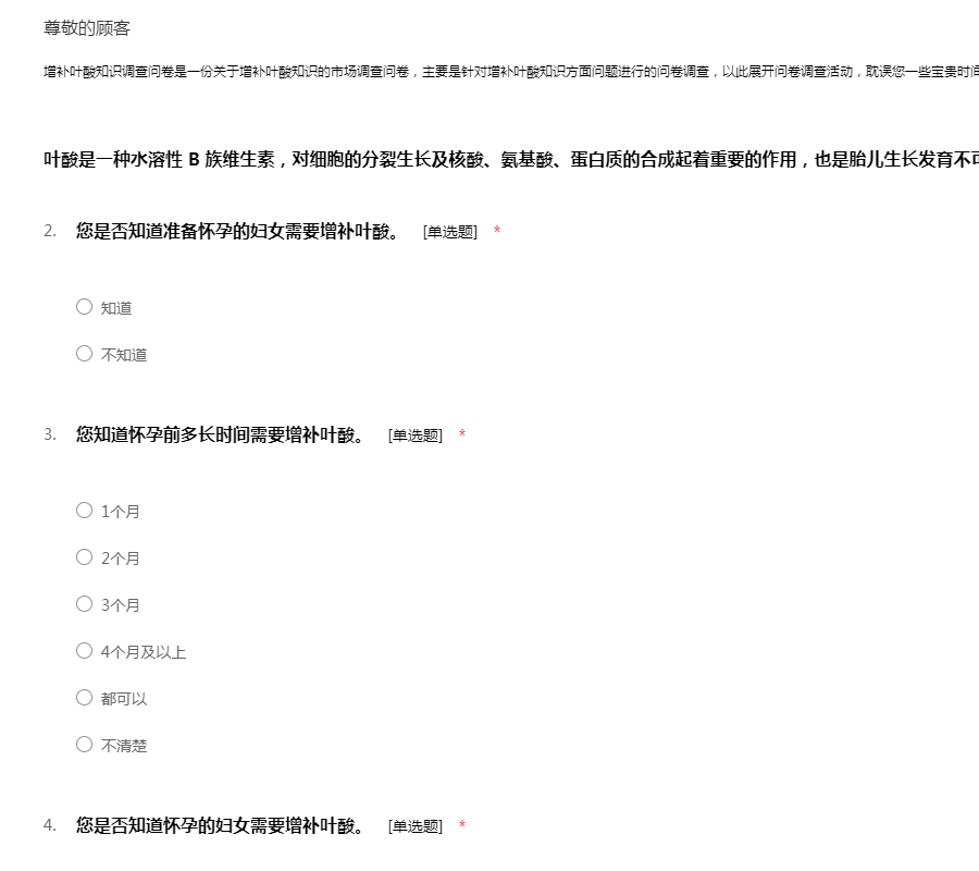 增补叶酸知识调查问卷是一份关于增补叶酸知识的市场调查问卷,主要是针对增补叶酸知识方面问题进行的问卷调查,以此展开问卷调查活动,耽误您一些宝贵时间,回答增补叶酸知识调查问卷,谢谢您的合作。