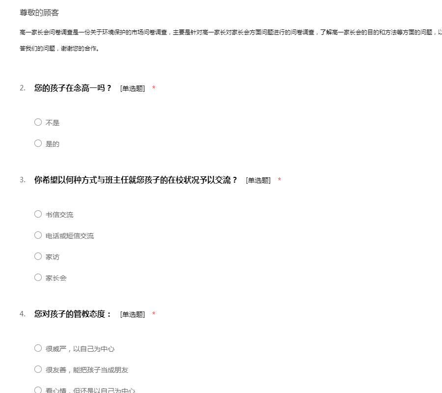 高一家长会问卷调查是一份关于环境保护的市场问卷调查,主要是针对高一家长对家长会方面问题进行的问卷调查,了解高一家长会的目的和方法等方面的问题,以此展开问卷调查活动,耽误您一些宝贵时间,回答我们的问题,谢谢您的合作。
