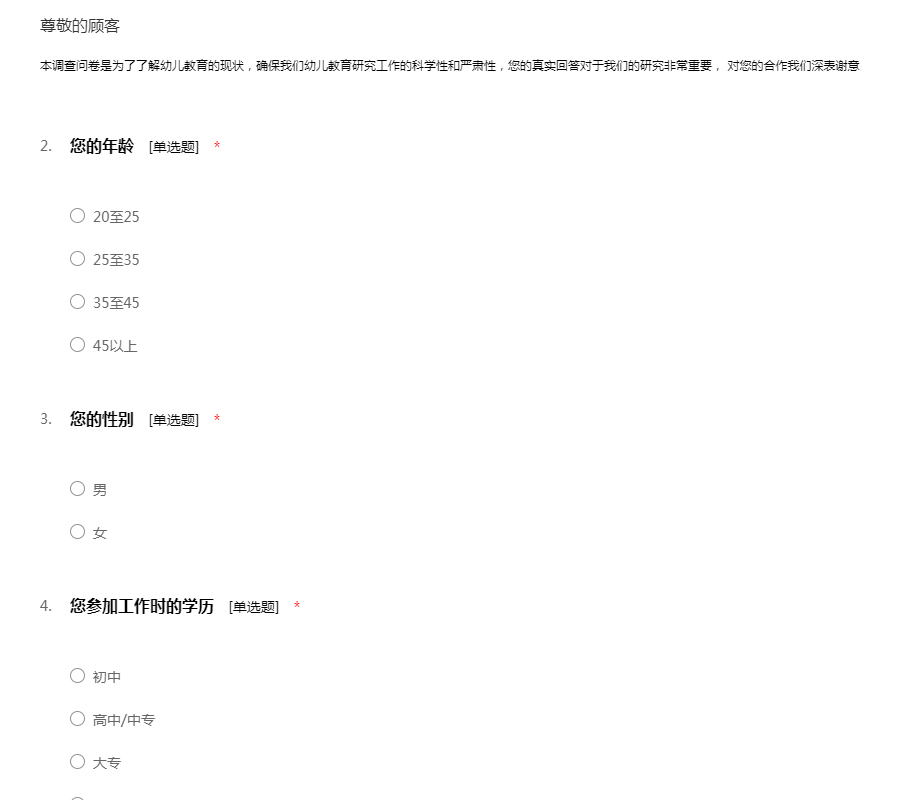 本调查问卷是为了了解幼儿教育的现状,确保我们幼儿教育研究工作的科学性和严肃性,您的真实回答对于我们的研究非常重要, 对您的合作我们深表谢意