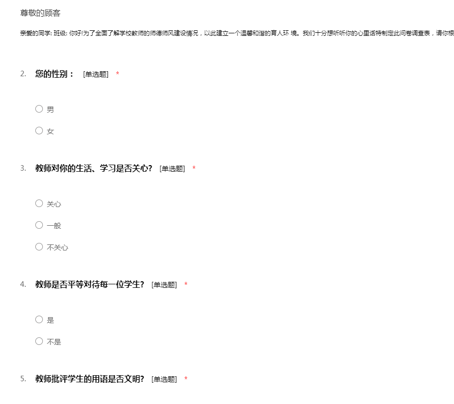 亲爱的同学: 班级: 你好!为了全面了解学校教师的师德师风建设情况,以此建立一个温馨和谐的育人环 境。我们十分想听听你的心里话特制定此问卷调查表,请你根据实际情况如实填写。