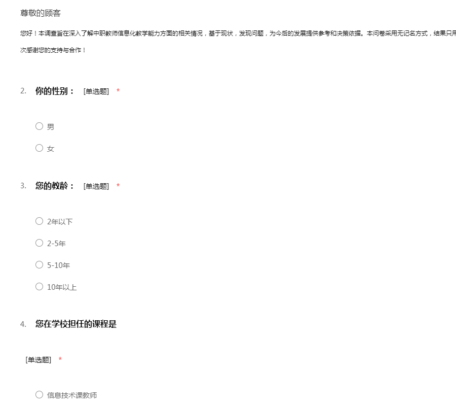 您好!本调查旨在深入了解中职教师信息化教学能力方面的相关情况,基于现状,发现问题,为今后的发展提供参考和决策依据。本问卷采用无记名方式,结果只用于科学研究,我们将为您保密,请放心填写,再次感谢您的支持与合作!