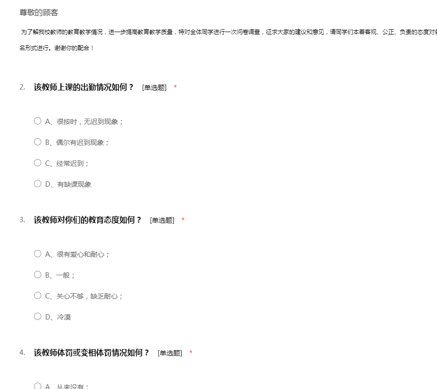 为了解我校教师的教育教学情况,进一步提高教育教学质量,特对全体同学进行一次问卷调查,征求大家的建议和意见,请同学们本着客观、公正、负责的态度对各位教师的工作表现予以评价。本次调查以无记名形式进行。谢谢你的配合!