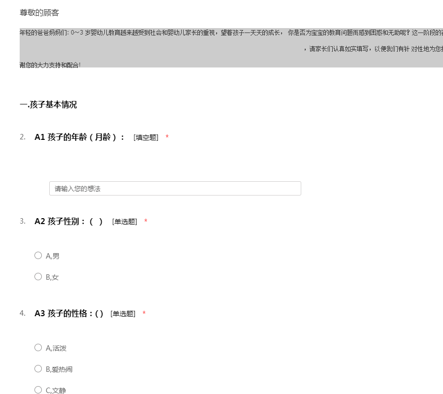 年轻的爸爸妈妈们: 0~3 岁婴幼儿教育越来越受到社会和婴幼儿家长的重视,望着孩子一天天的成长, 你是否为宝宝的教育问题而感到困惑和无助呢?这一阶段的孩子该接受怎样的教育,又 如何实施呢?亲子园向您敞开大门,欢迎您和孩子的到来。在我们潜心研究0~3 岁婴 幼儿早期教育之际,我们拟定了这个问卷调查,请家长们认真如实填写,以便我们有针 对性地为您提供家教指导,为孩子提供良好的教育环境。感谢您的大力支持和配合!