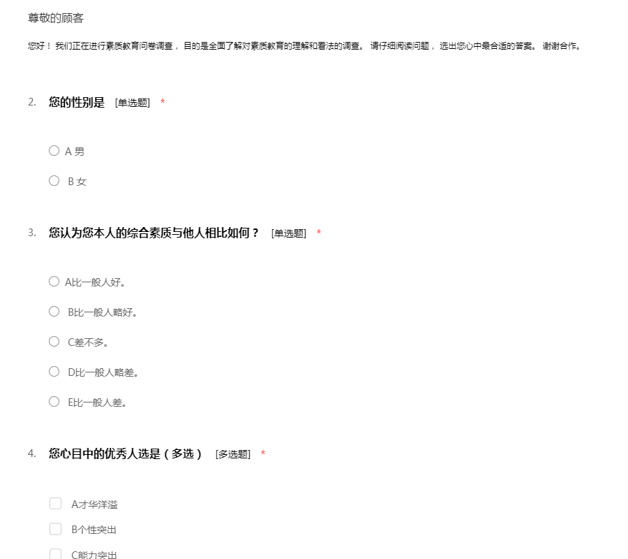 您好! 我们正在进行素质教育问卷调查, 目的是全面了解对素质教育的理解和看法的调查。 请仔细阅读问题, 选出您心中最合适的答案。 谢谢合作。
