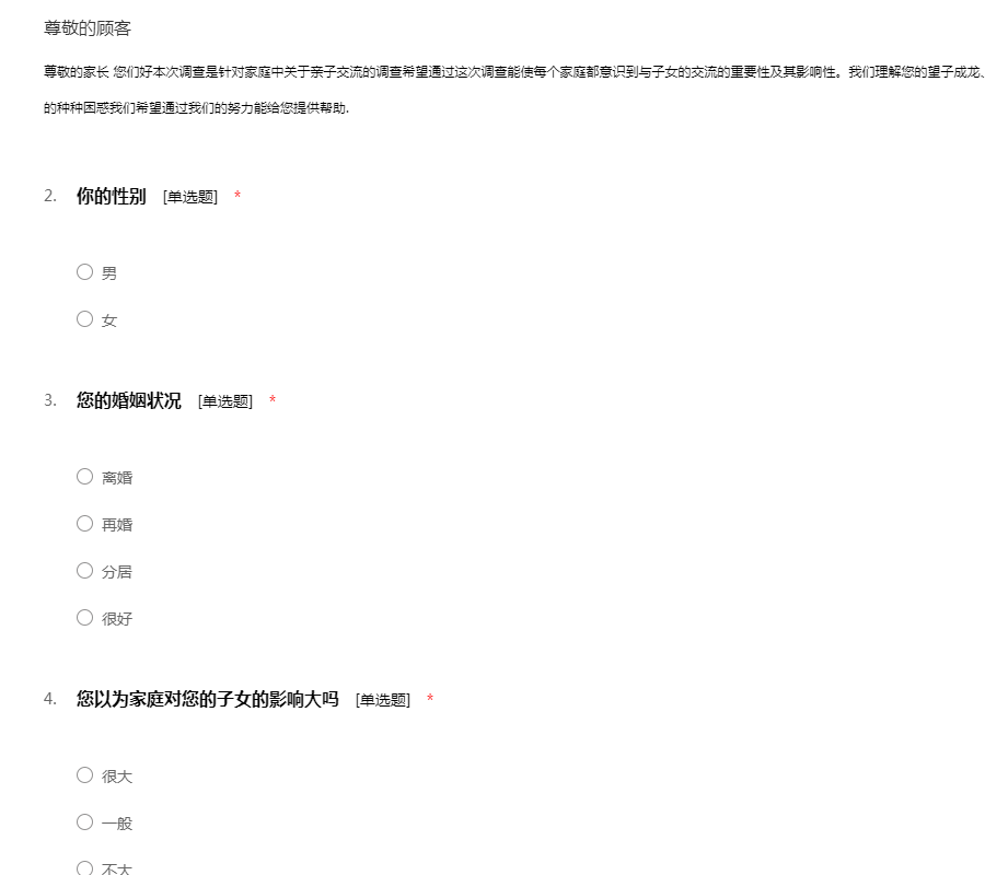 尊敬的家长 您们好本次调查是针对家庭中关于亲子交流的调查希望通过这次调查能使每个家庭都意识到与子女的交流的重要性及其影响性。我们理解您的望子成龙、望女成凤之心我们能体会您在教育孩子过程中的种种困惑我们希望通过我们的努力能给您提供帮助.
