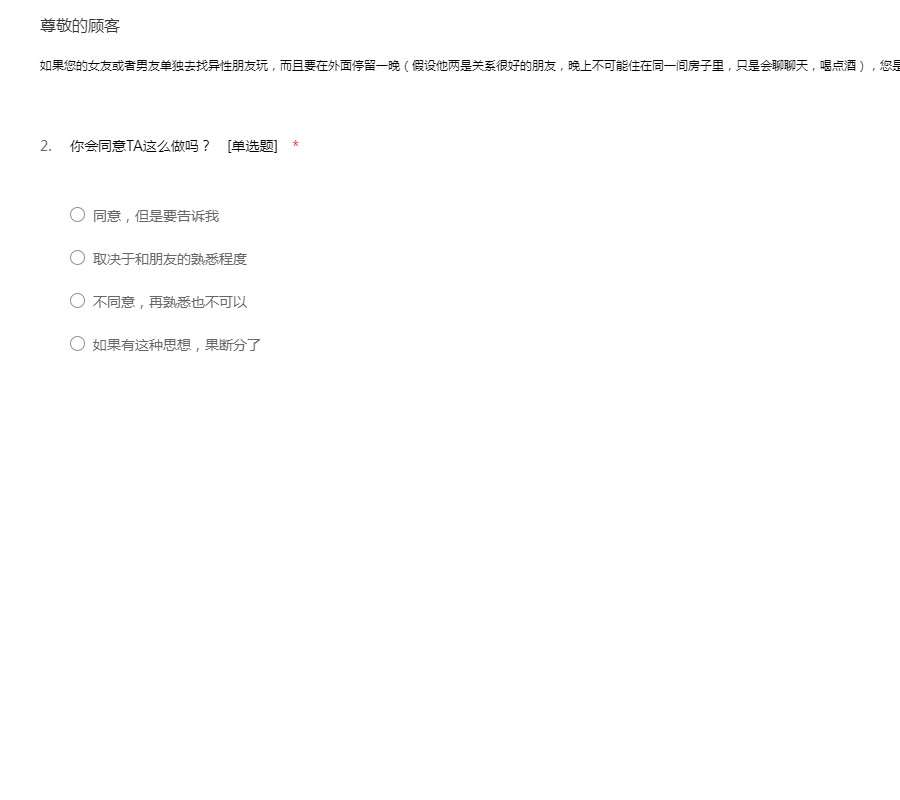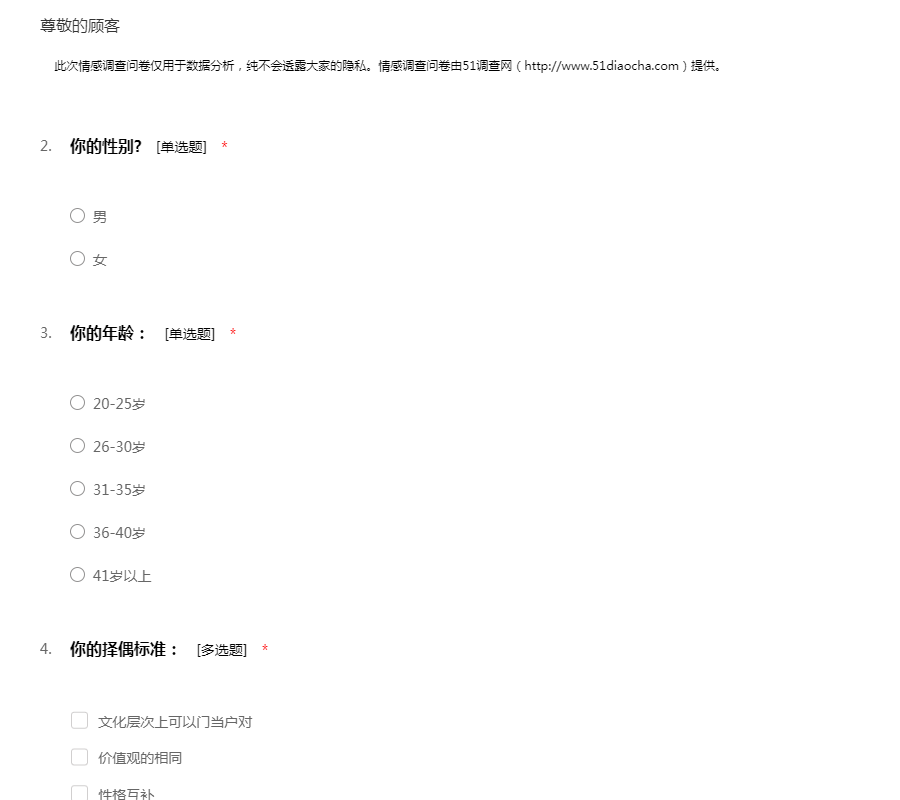 此次情感调查问卷仅用于数据分析,纯不会透露大家的隐私。情感调查问卷由51调查网(http://www.51diaocha.com)提供。