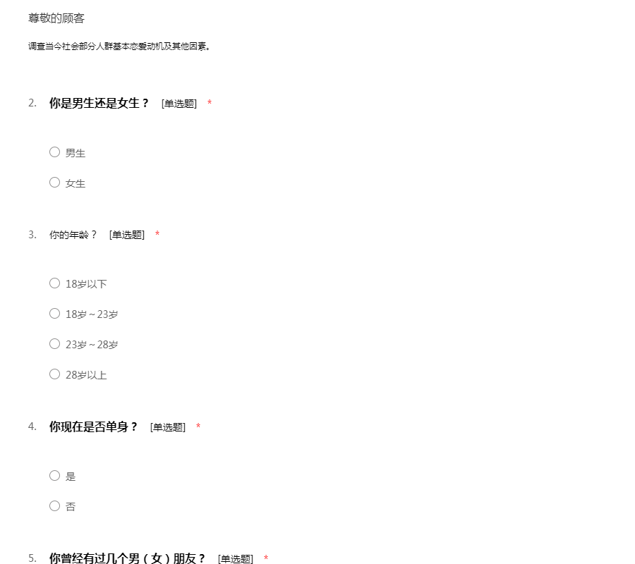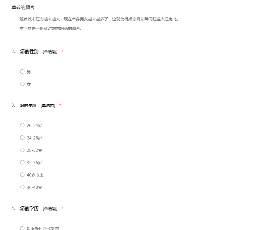 随着城市压力越来越大,现在单身男女越来越多了,这就使得婚恋网站瞬间红遍大江南北。 本问卷是一份针对婚恋网站的调查。