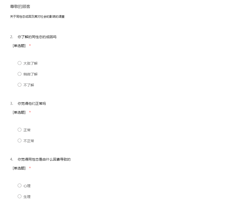 随着社会的开放,同性恋这种复杂的人类社会问题在个人权利、社会伦理、自然法则、心理学等方面引起了广泛的争议,或许这种争议仍将继续下去。也正因为有了这许多的争议,人们就在争议里一起找寻那许多问题背后的答案和解决的方法,引导其向理性的方向发展。 问卷保密,请放心填写 ~ˇ~