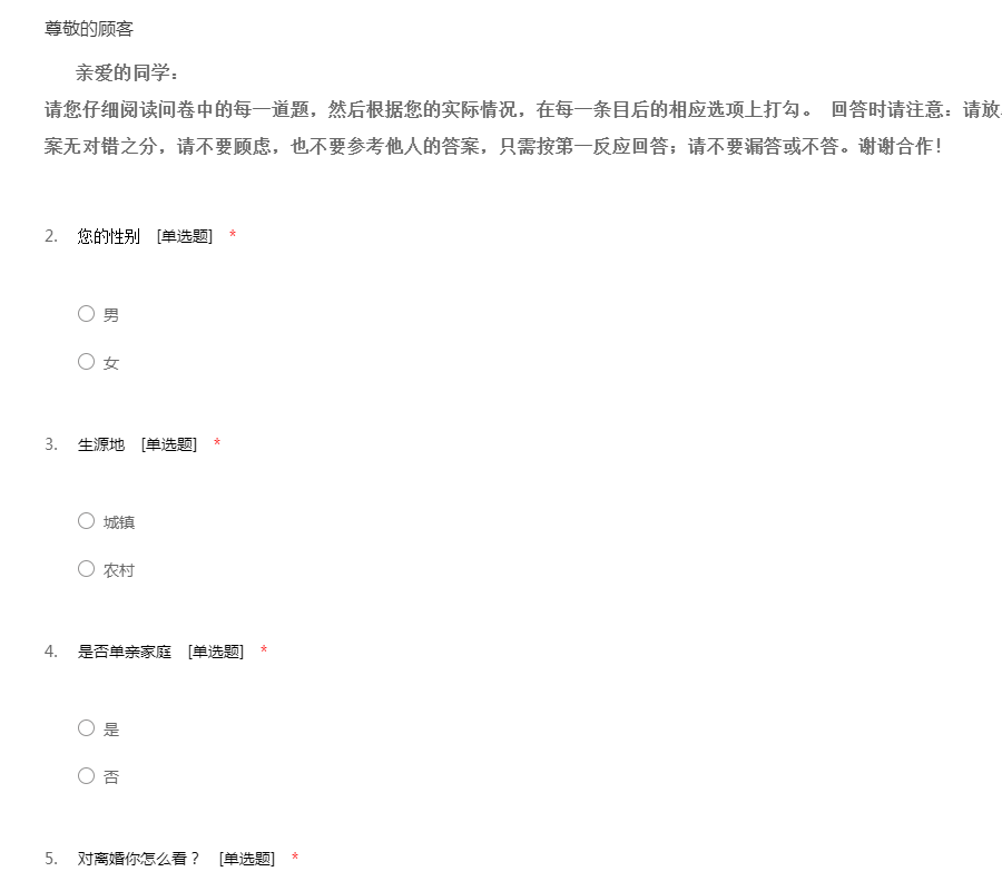 亲爱的同学: 请您仔细阅读问卷中的每一道题,然后根据您的实际情况,在每一条目后的相应选项上打勾。 回答时请注意:请放心作答,测试结果将完全保密;答案无对错之分,请不要顾虑,也不要参考他人的答案,只需按第一反应回答;请不要漏答或不答。谢谢合作!