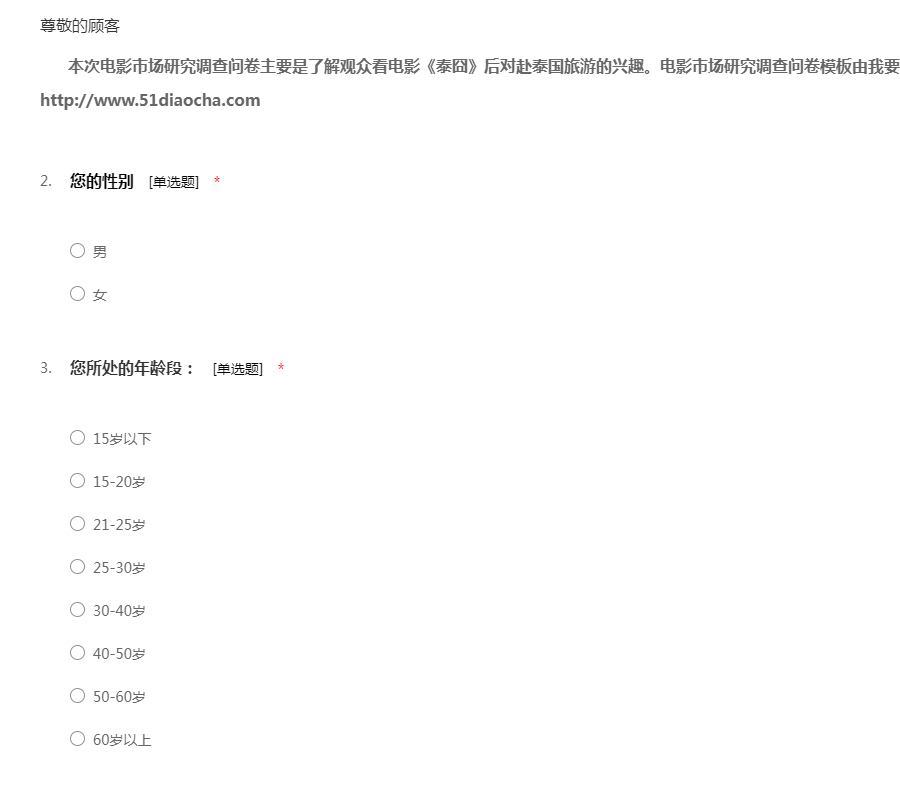本次电影市场研究调查问卷主要是了解观众看电影《泰囧》后对赴泰国旅游的兴趣。电影市场研究调查问卷模板由我要调查网提供,网址: http://www.51diaocha.com