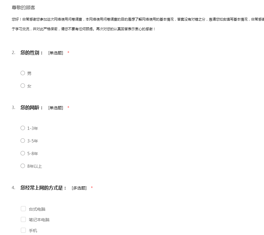 您好!非常感谢您参加这次网络使用问卷调查,本网络使用问卷调查的目的是想了解网络使用的基本情况,答案没有对错之分,恳请您如实填写基本情况,非常感谢您的支持与合作。我们 承诺本次调查结果仅用于学习交流,并对此严格保密,请您不要有任何顾虑。再次对您的认真回答表示衷心的感谢!