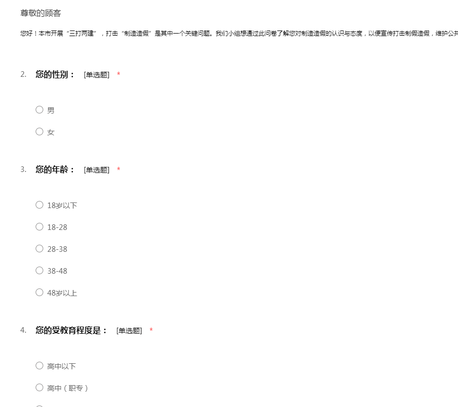 您好!本市开展“三打两建”,打击“制造造假”是其中一个关键问题。我们小组想通过此问卷了解您对制造造假的认识与态度,以便宣传打击制假造假,维护公共利益。感谢您的支持。