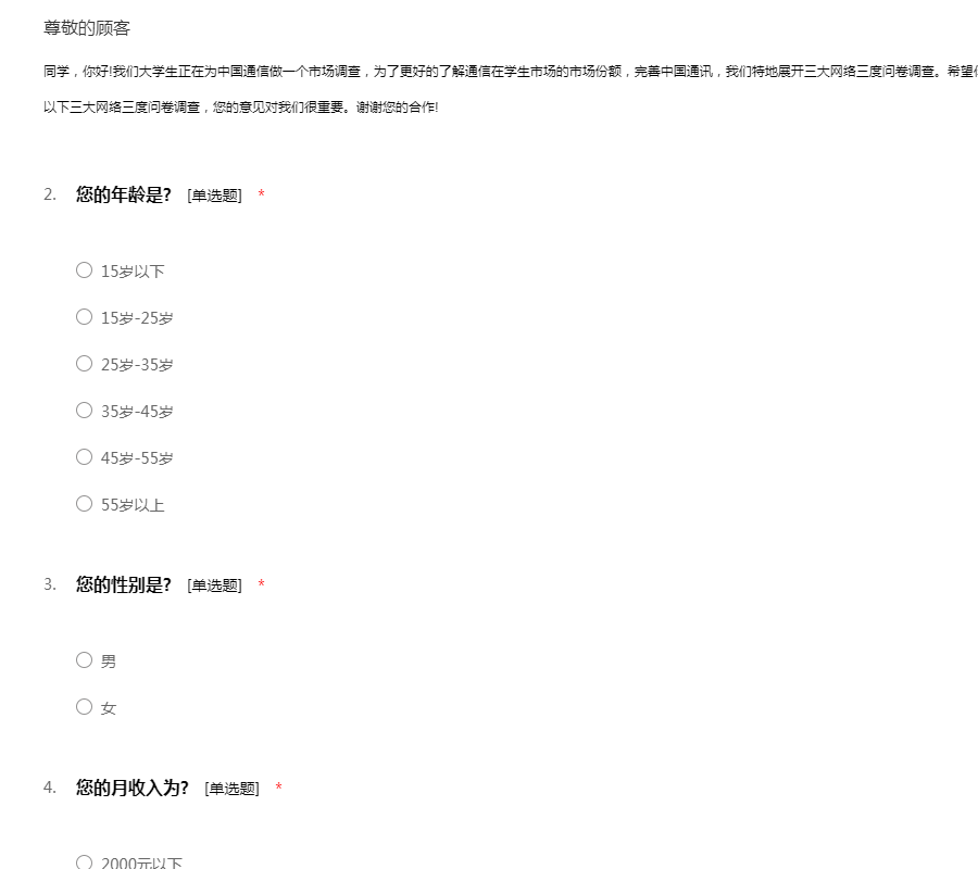 同学,你好!我们大学生正在为中国通信做一个市场调查,为了更好的了解通信在学生市场的市场份额,完善中国通讯,我们特地展开三大网络三度问卷调查。希望你在百忙之中抽出一点宝贵时间,协助我们完成以下三大网络三度问卷调查,您的意见对我们很重要。谢谢您的合作!