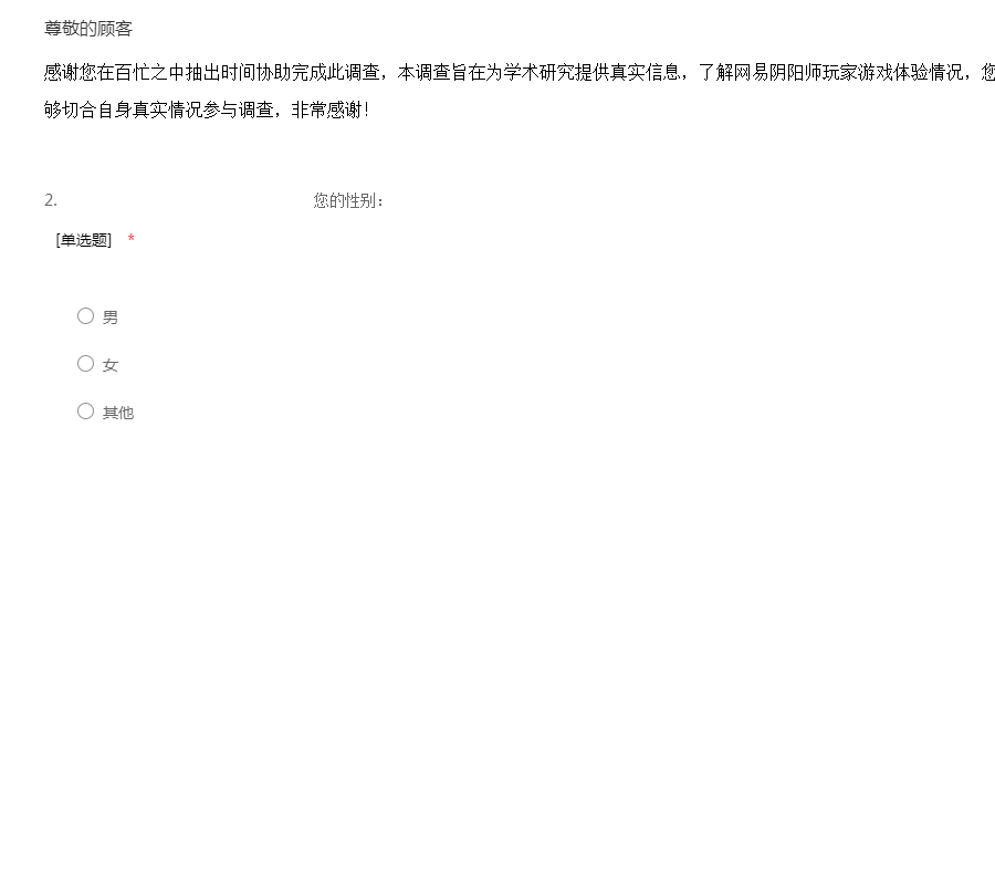 感谢您在百忙之中抽出时间协助完成此调查,本调查旨在为学术研究提供真实信息,了解网易阴阳师玩家游戏体验情况,您填写的信息将绝对保密,希望您能够切合自身真实情况参与调查,非常感谢!