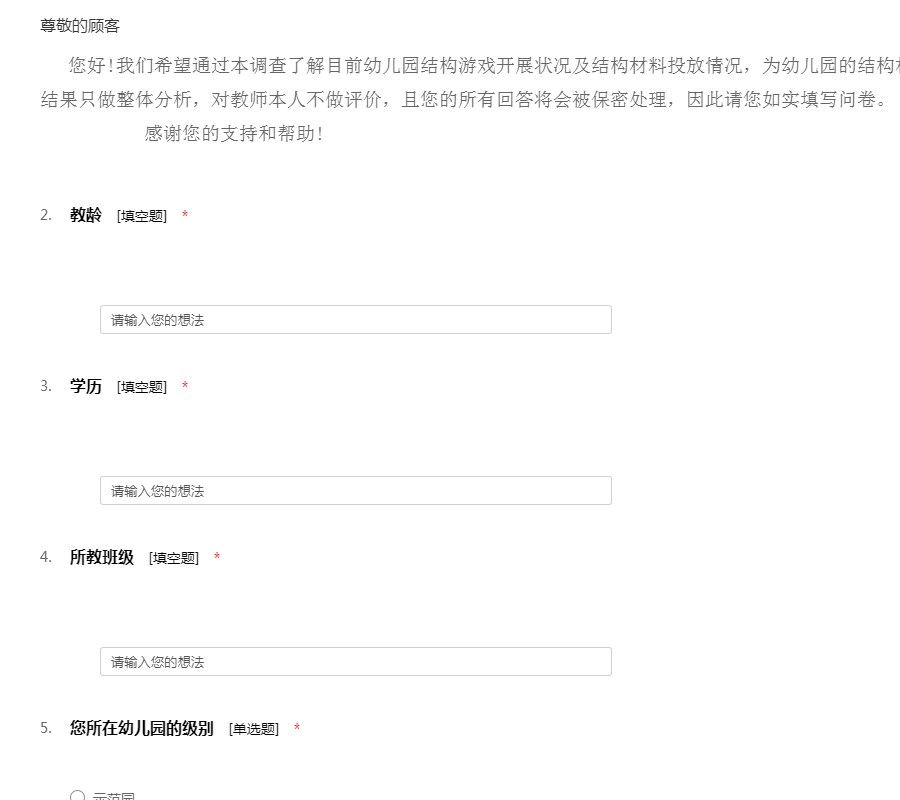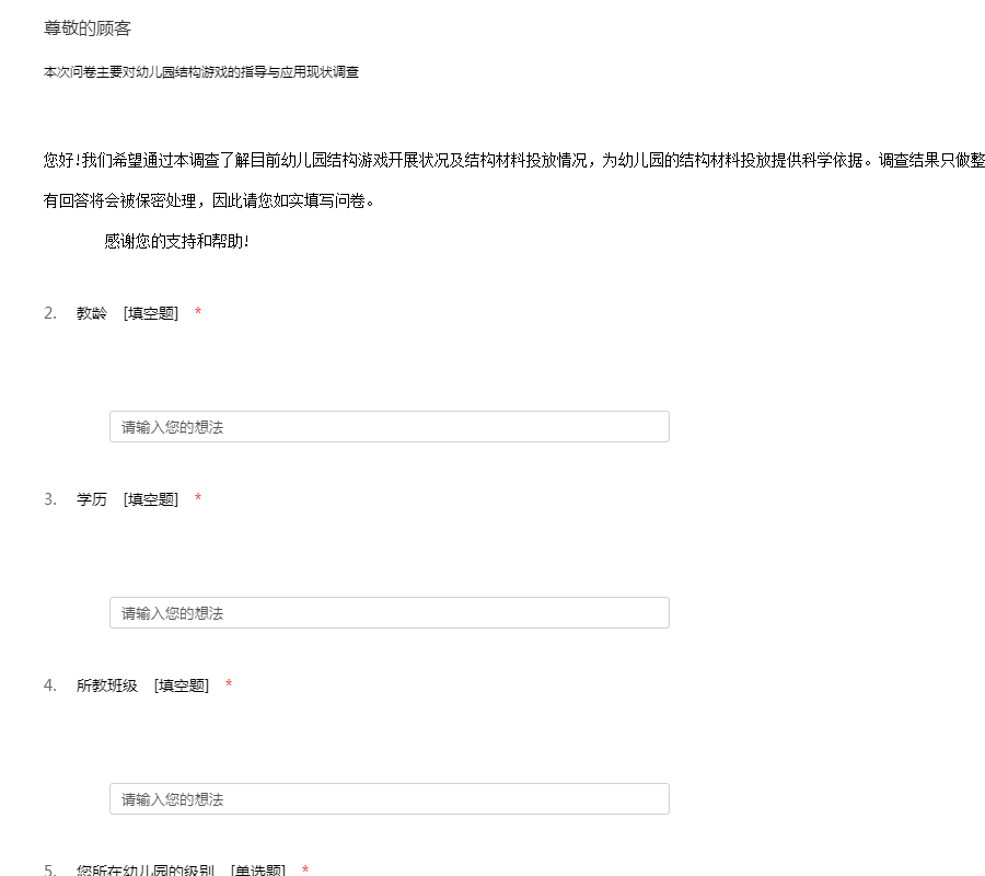 您好!我们希望通过本调查了解目前幼儿园结构游戏开展状况及结构材料投放情况,为幼儿园的结构材料投放提供科学依据。调查结果只做整体分析,对教师本人不做评价,且您的所有回答将会被保密处理,因此请您如实填写问卷。 感谢您的支持和帮助!