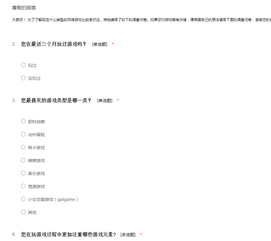 大家好! 为了了解现在什么类型的网络游戏比较受欢迎,特地编写了如下的调查问卷。如果您对游戏略有涉猎,请根据自己的想法填写下面的调查问卷,感谢您的参与!谢谢!