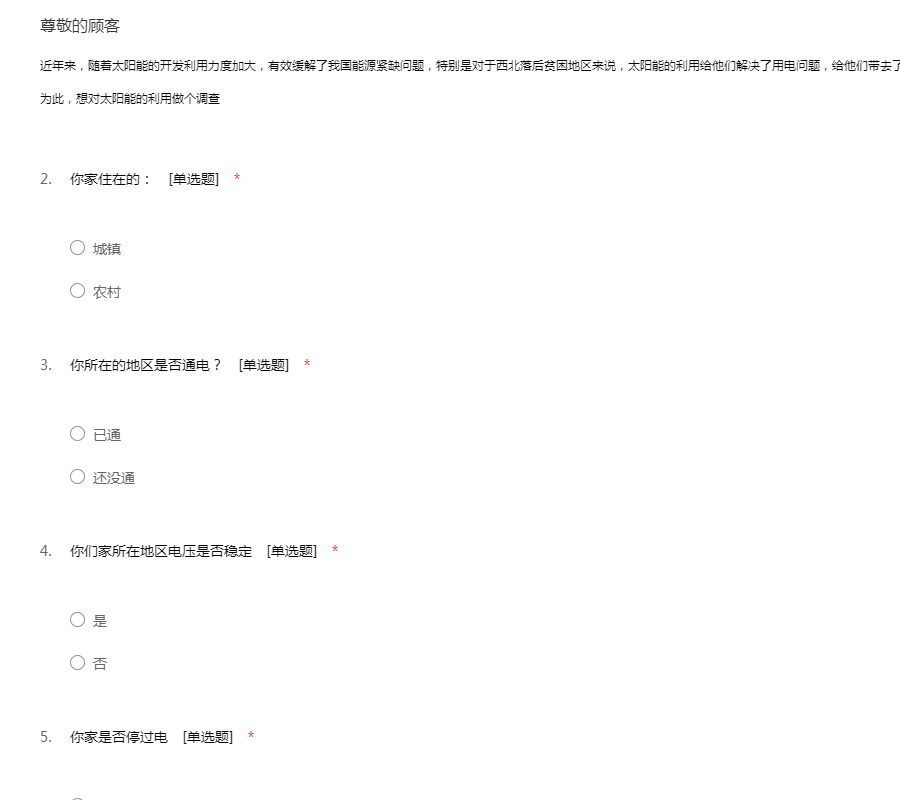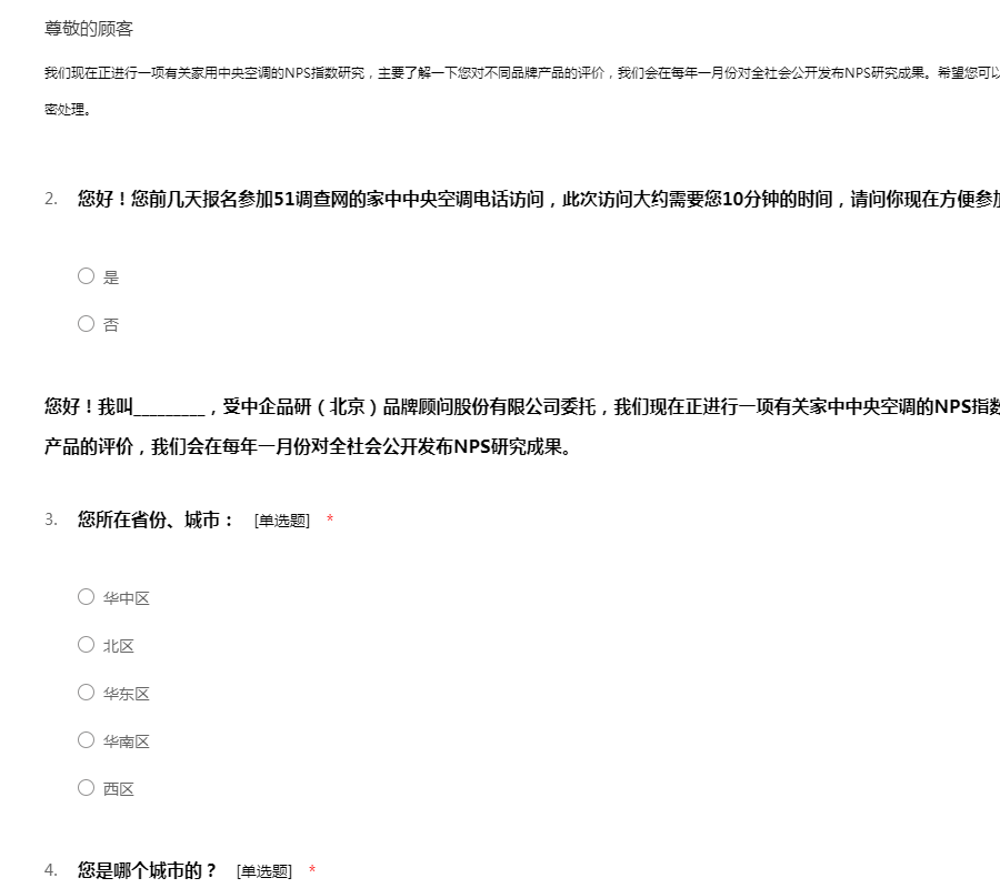 亲爱的用户: 您好,我是xxxx的调查员xx,为了了解消费者中央空调及其他家电的使用情况,我们开展了此次调研,您根据自身的实际情况填写即可,问卷中可能会涉及一些基本信息,我们仅作研究分析使用,请放心填写。 非常感谢您的积极参与! XXX 2018.1.1