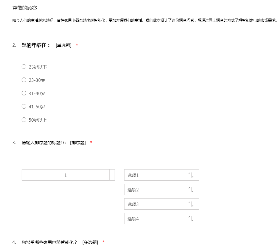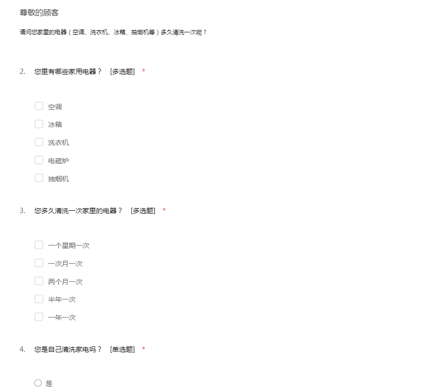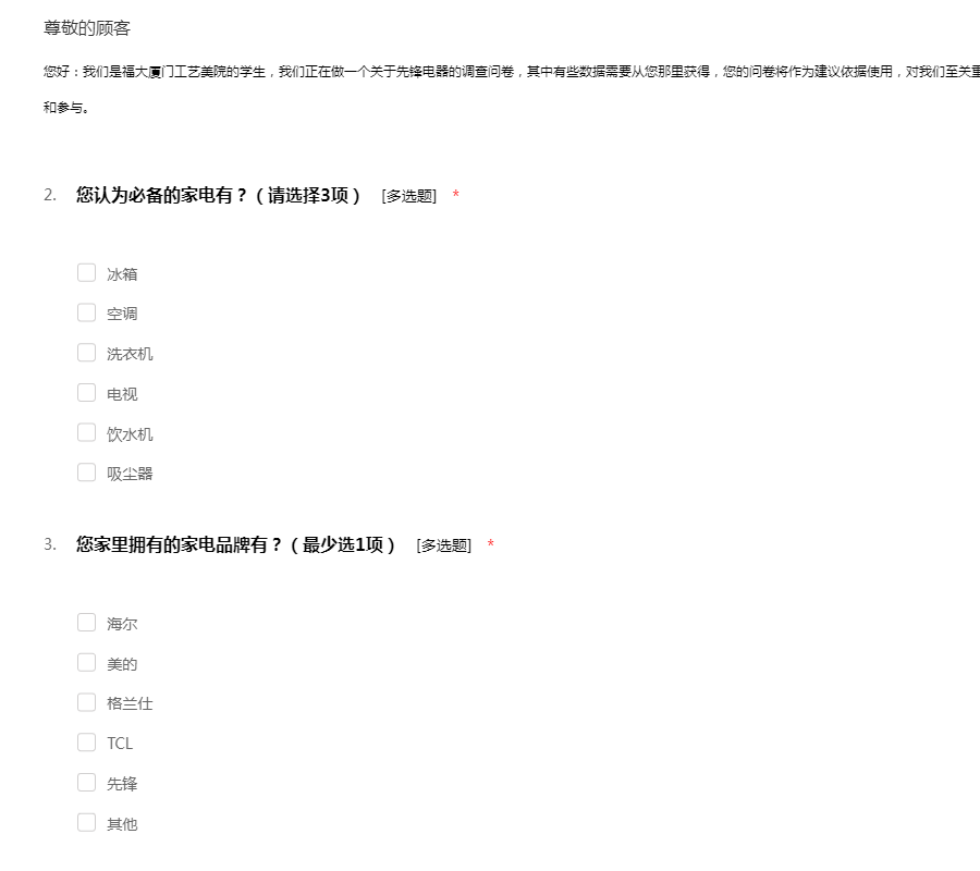 尊敬的消费者,您好!感谢您在百忙之余,协助我们完成这份问卷。此次我们想对电器市场进行了解,所以特此设计了这份电器市场调查问卷。本问卷采取匿名制,所以请放心的写下您的真实想法。感谢您对我们的支持!