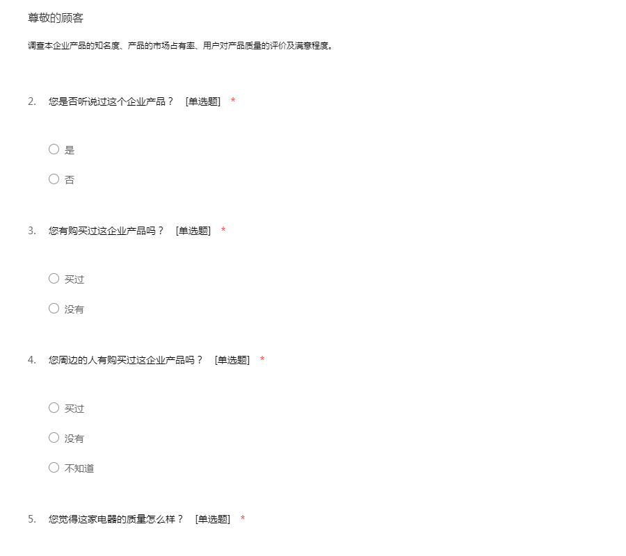 调查本企业产品的知名度、产品的市场占有率、用户对产品质量的评价及满意程度。