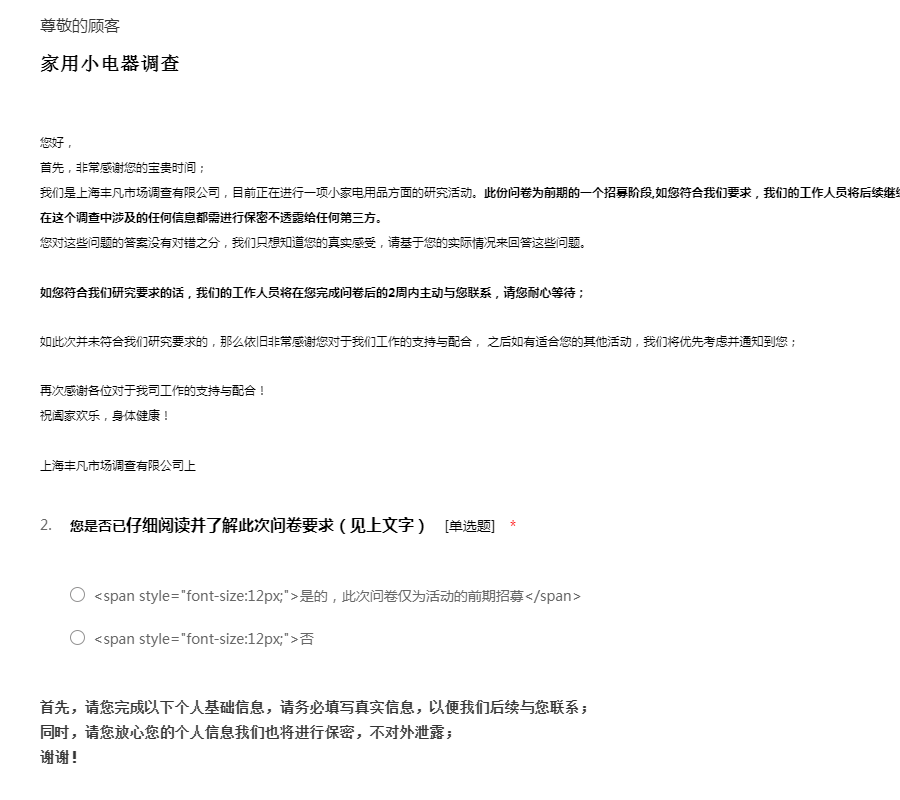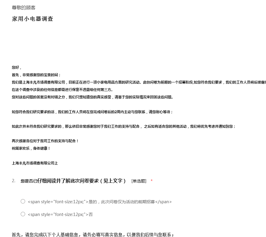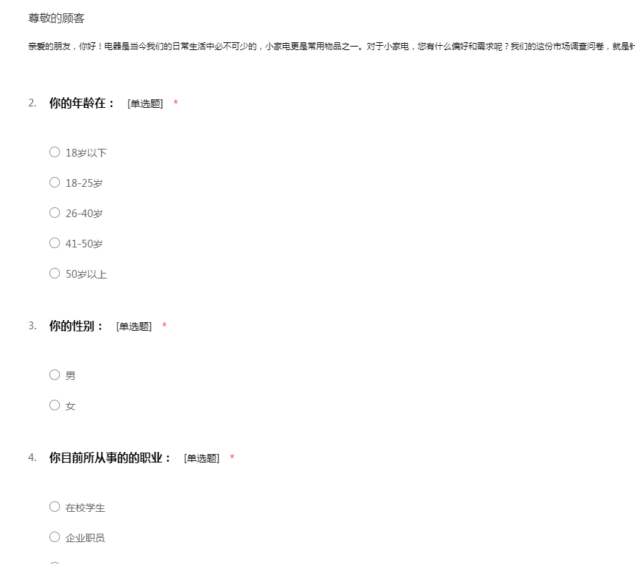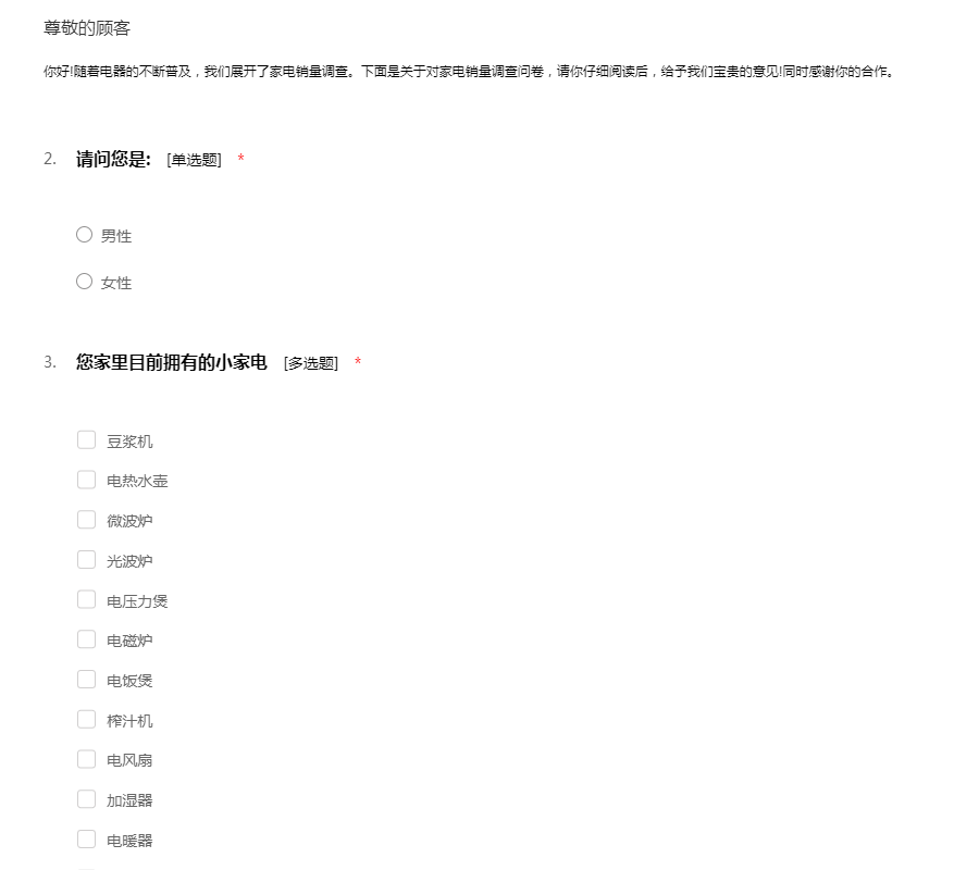 亲爱的朋友,你好!电器是当今我们的日常生活中必不可少的,小家电更是常用物品之一。对于小家电,您有什么偏好和需求呢?我们的这份市场调查问卷,就是针对小家电而设计的。感谢您的积极参与!