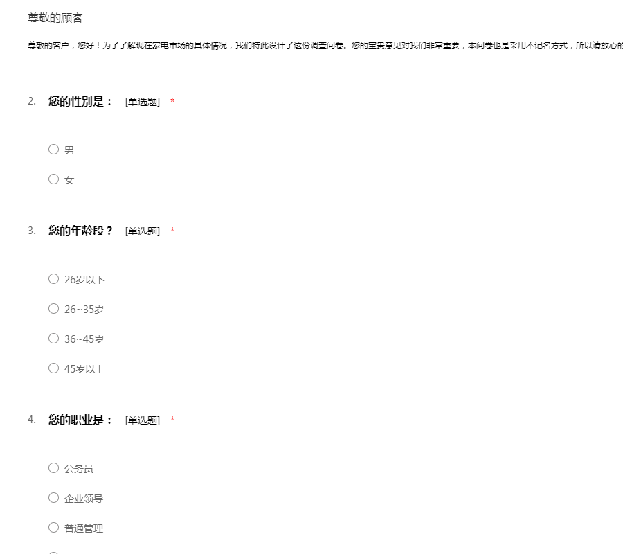 尊敬的客户,您好!为了了解现在家电市场的具体情况,我们特此设计了这份调查问卷。您的宝贵意见对我们非常重要,本问卷也是采用不记名方式,所以请放心的如实填写。感谢您的支持!