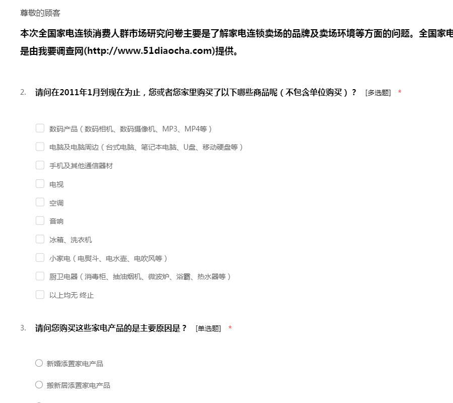 尊敬的消费者,您好!我们现在展开对家电的市场问卷调查,希望得到您的支持。问卷采用不记名方式,所以请放心填答。您的宝贵建议对我们的市场调研非常重要,所以请务必根据实际情况填答。感谢您的支持与合作!