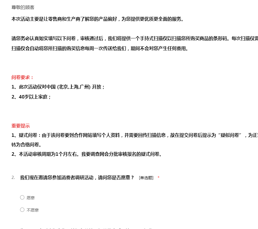 请您务必认真如实填写以下问卷,审核通过后,我们将提供一个手持式扫描仪以扫描您所购买商品的条形码。每次扫描仅需几分钟的时间。