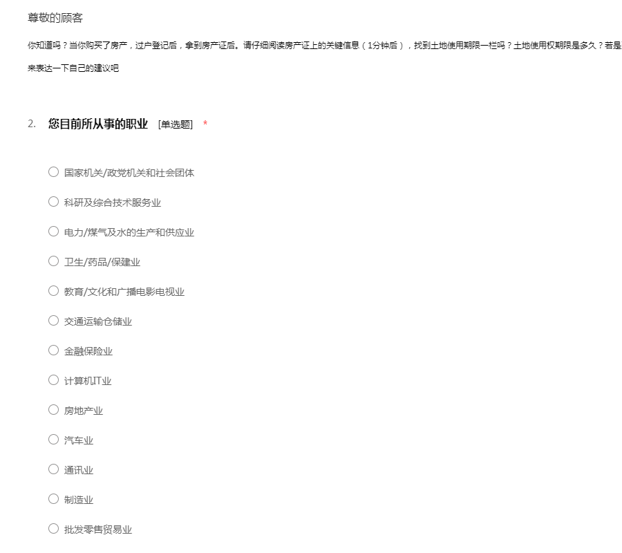 先生/女士: 您好! 我们是广东交通职业技术学院的房地产专业的学生,目前正在进行一个房地产方面的作业,现需要您帮我做一份问卷,我们将对您的回答严格保密。希望您在百忙之中抽出一点时间协助我们完成这次调查。谢谢您的支持与合作!