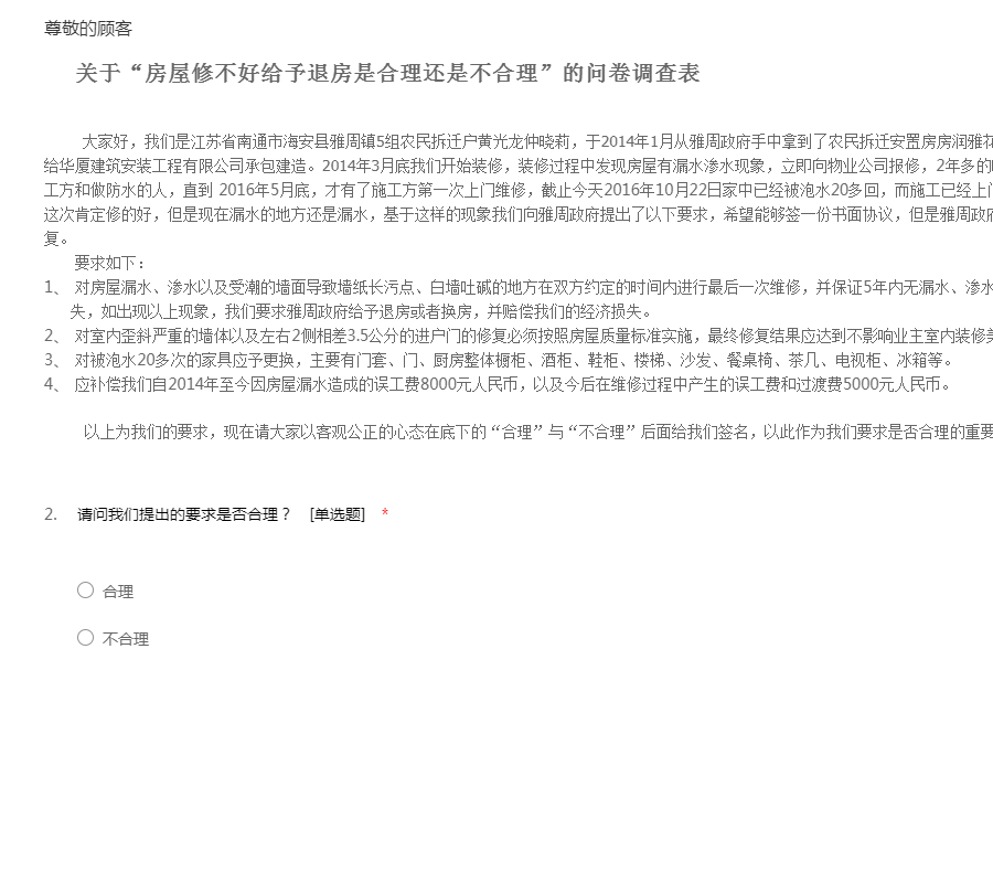 关于“房屋修不好给予退房是合理还是不合理”的问卷调查表 大家好,我们是江苏省南通市海安县雅周镇5组农民拆迁户黄光龙仲晓莉,于2014年1月从雅周政府手中拿到了农民拆迁安置房房润雅花苑7#501室,该栋楼由海安代建中心分包给华厦建筑安装工程有限公司承包建造。2014年3月底我们开始装修,装修过程中发现房屋有漏水渗水现象,立即向物业公司报修,2年多的时间,我们跑了无数次物业,打电话给施工方和做防水的人,直到 2016年5月底,才有了施工方第一次上门维修,截止今天2016年10月22日家中已经被泡水20多回,而施工已经上门维修了10多次了,而每次都是口头保证这次肯定修的好,但是现在漏水的地方还是漏水,基于这样的现象我们向雅周政府提出了以下要求,希望能够签一份书面协议,但是雅周政府部门以我们要求不合理一直不给予答复。 要求如下: 1、 对房屋漏水、渗水以及受潮的墙面导致墙纸长污点、白墙吐碱的地方在双方约定的时间内进行最后一次维修,并保证5年内无漏水、渗水等现象再次造成我们业主室内财产的损失,如出现以上现象,我们要求雅周政府给予退房或者换房,并赔偿我们的经济损失。 2、 对室内歪斜严重的墙体以及左右2侧相差3.5公分的进户门的修复必须按照房屋质量标准实施,最终修复结果应达到不影响业主室内装修美观效果。 3、 对被泡水20多次的家具应予更换,主要有门套、门、厨房整体橱柜、酒柜、鞋柜、楼梯、沙发、餐桌椅、茶几、电视柜、冰箱等。 4、 应补偿我们自2014年至今因房屋漏水造成的误工费8000元人民币,以及今后在维修过程中产生的误工费和过渡费5000元人民币。 以上为我们的要求,现在请大家以客观公正的心态在底下的“合理”与“不合理”后面给我们签名,以此作为我们要求是否合理的重要依据,我们在这里谢谢您的支持与理解。
