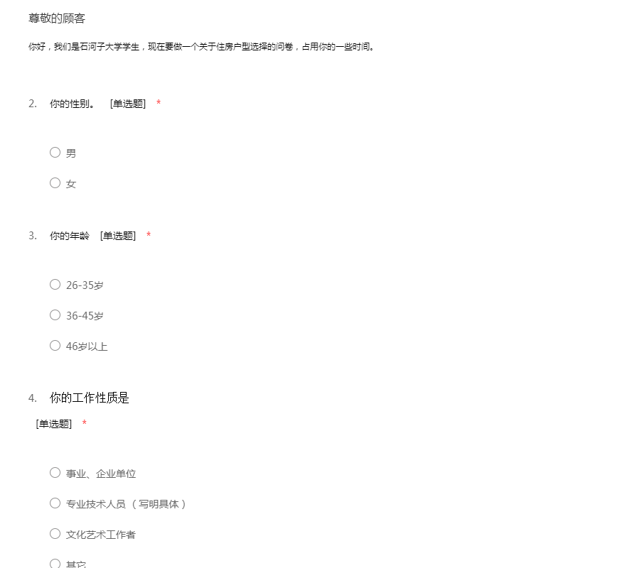 你好,我们是石河子大学学生,现在要做一个关于住房户型选择的问卷,占用你的一些时间。