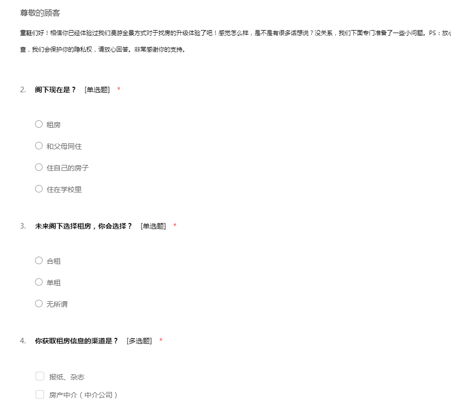 童鞋们好!相信你已经体验过我们漫游全景方式对于找房的升级体验了吧!感觉怎么样,是不是有很多话想说?没关系,我们下面专门准备了一些小问题。PS:放心,问卷所用数据均用于统计分析且为匿名调查,我们会保护你的隐私权,请放心回答。非常感谢你的支持。