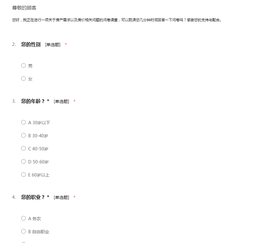 您好,我正在进行一项关于房产需求以及房价相关问题的问卷调查,可以耽误您几分钟时间回答一下问卷吗?感谢您的支持与配合。